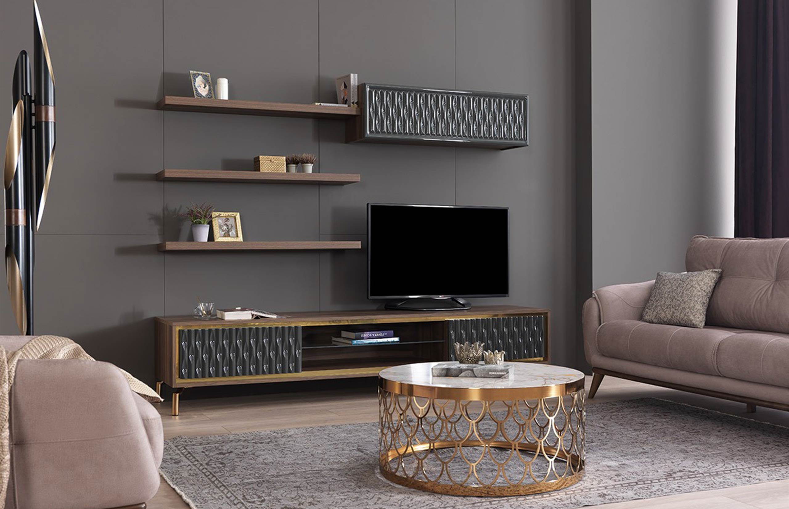 The GOLD TV Stand boasts a lavish design that effortlessly becomes the focal point of your interior. Its meticulously crafted shelves provide the ideal platform for media devices, gaming consoles, and decor items, allowing you to showcase your entertainment essentials in a sophisticated manner.