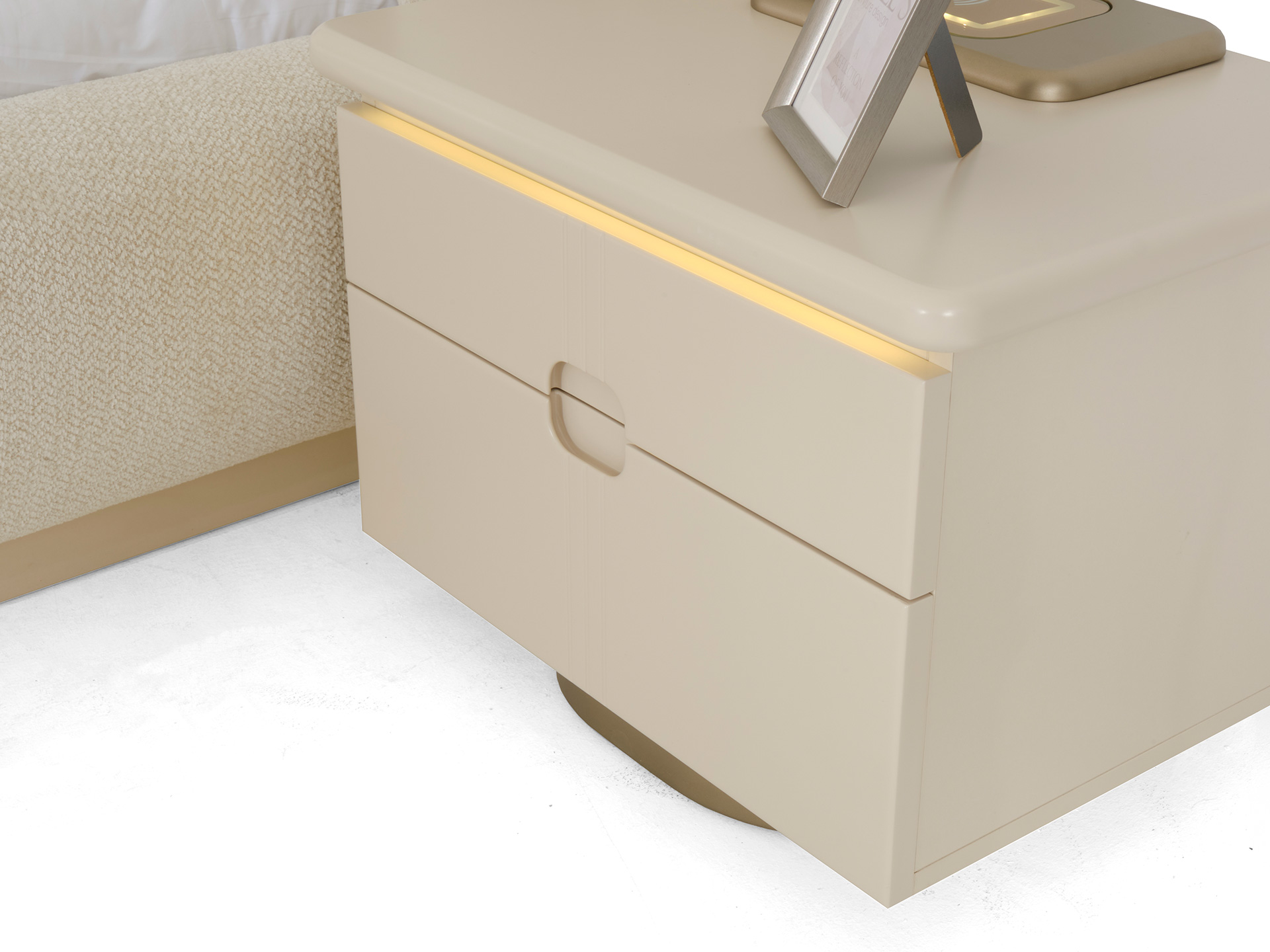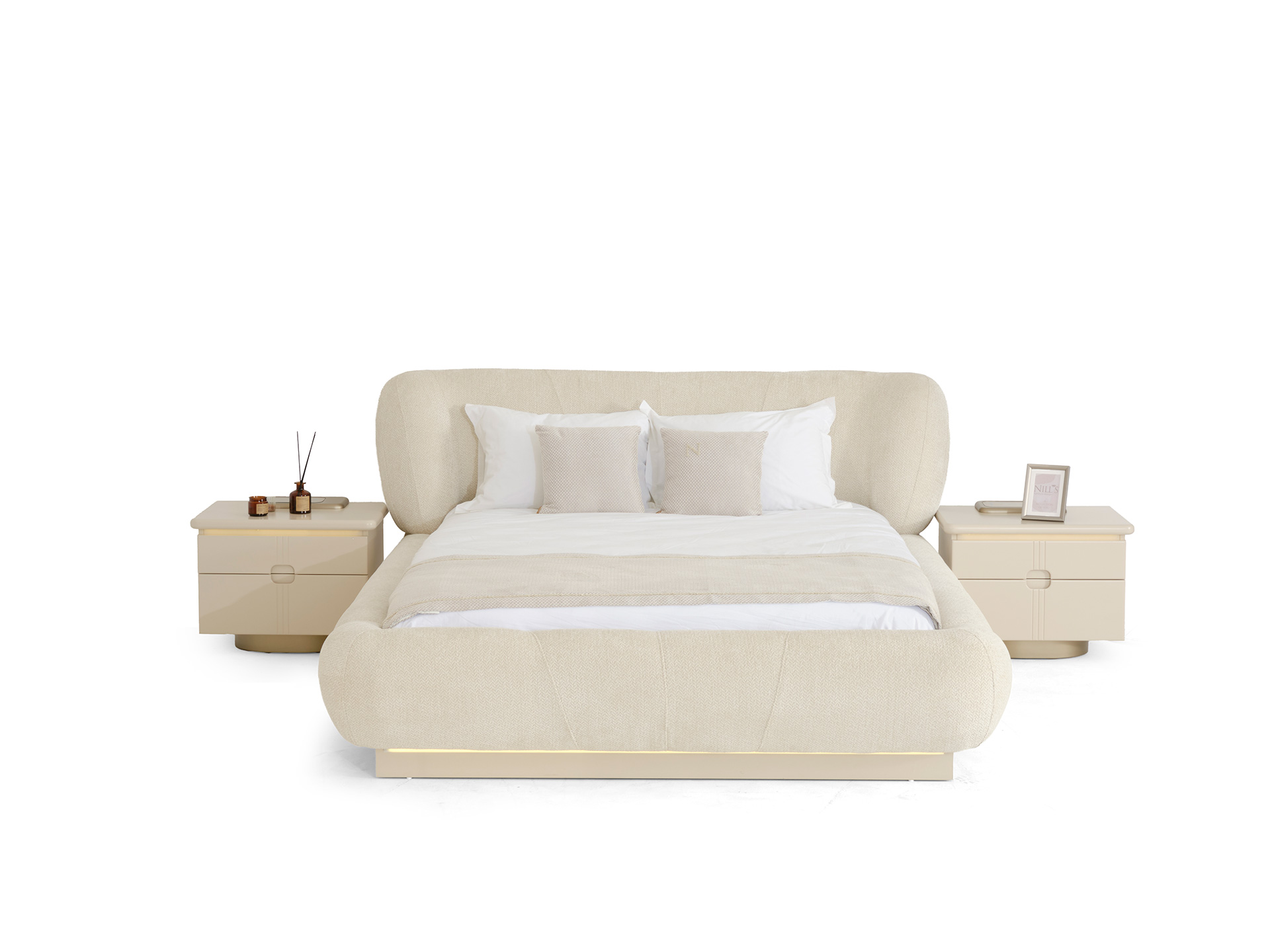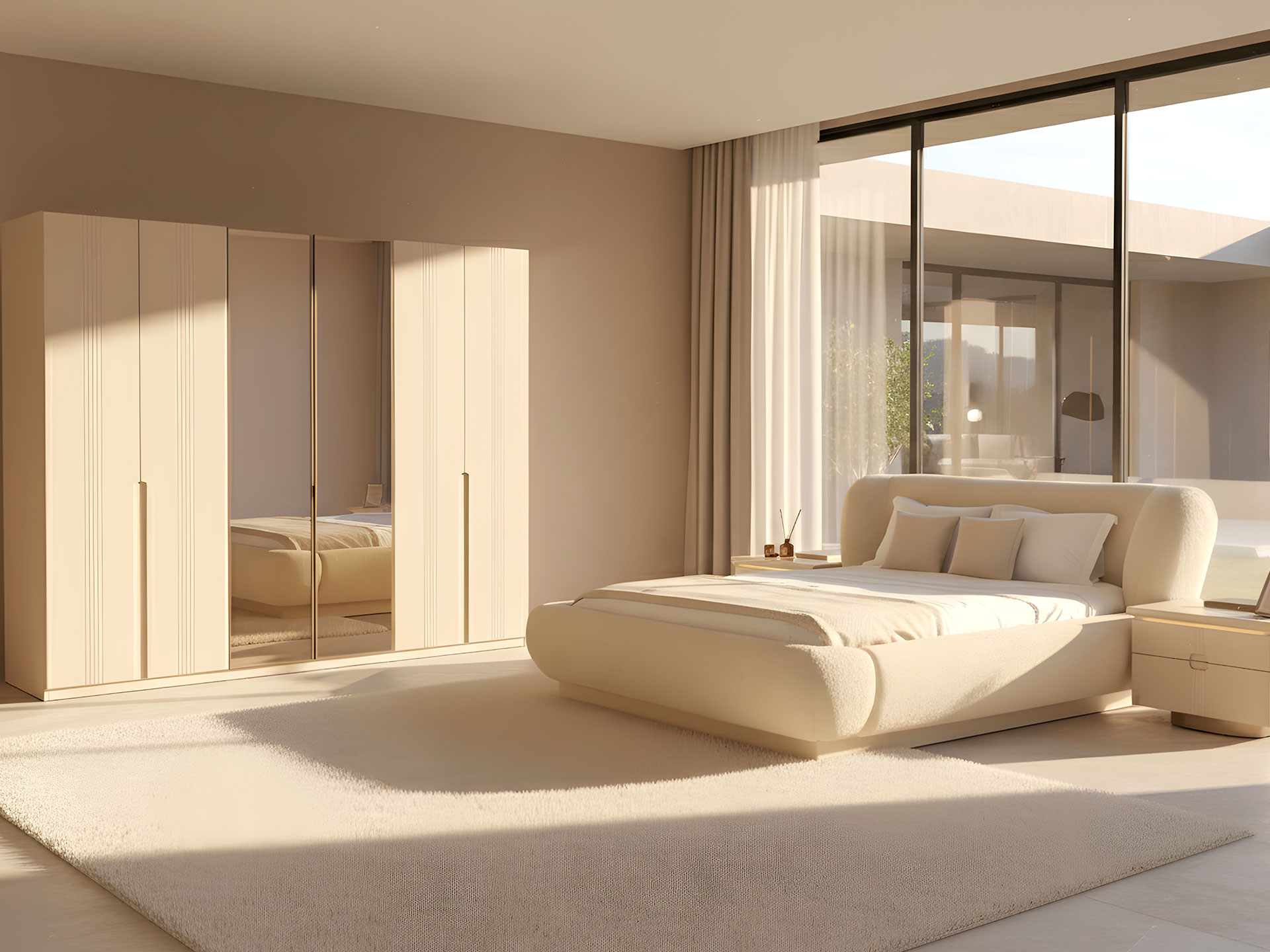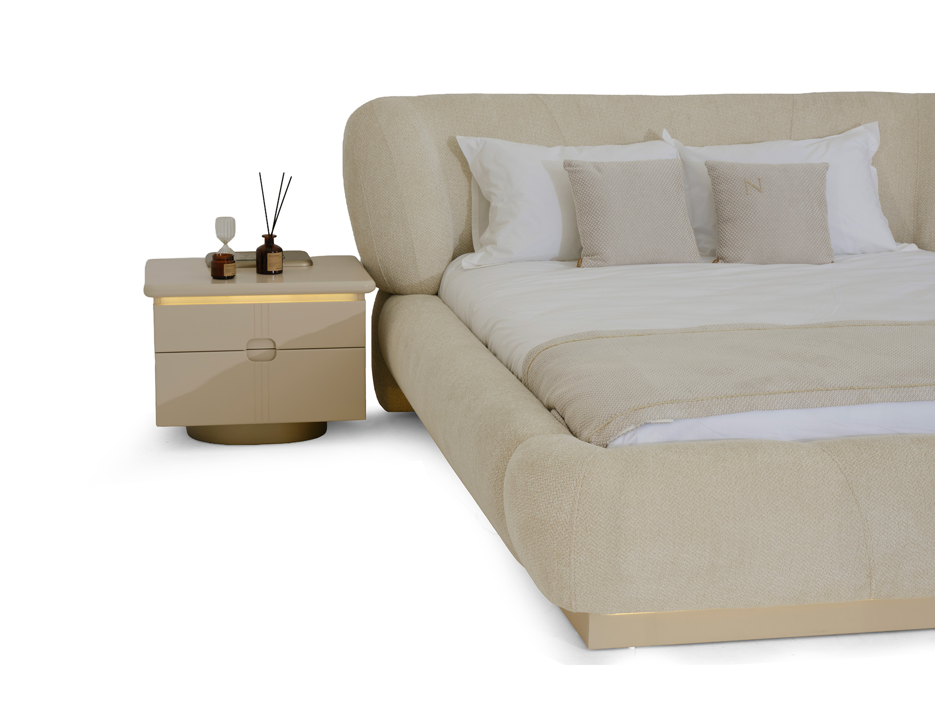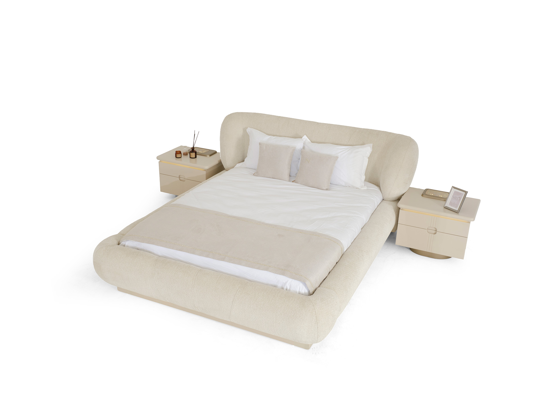Understated yet unforgettable, the Pera Bedroom Set balances soft shapes with modern lines. The plush headboard invites you to unwind, while the high-gloss surfaces and gold accents reflect a sense of quiet luxury. Every piece is designed to feel harmonious, warm, and effortlessly elegant.
